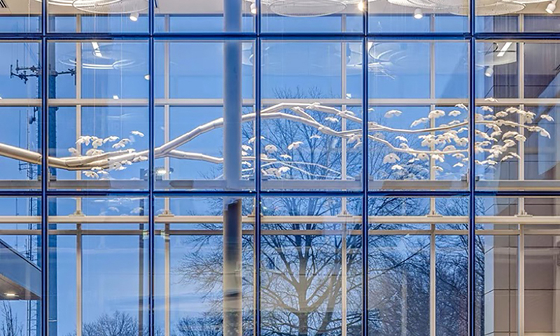 This is an aisle connecting two business center buildings. The design and creation of this lamp was inspired by a white plum tree bent by heavy snow. The petals of the ceramic white plum blossoms are matched with the silver trunk, which perfectly move the beauty of nature into indoors. It brings warm and peach for the people who goes through there.