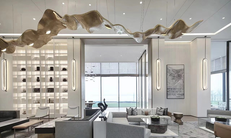 This new opening business center is for some private companies in running their operation. Yihe Interior Design company took over the interior design for the internal space. The entire hall follow the contemporary style with simple and graceful design concept. By customized all the lamps , the high end business style have been express well. The main pendant lamp pick up the copper with handmade forging technology, which show up the textured space . A series of glasses cube are insist of the lamp be matched with the window wall completely. The wall lamps and floor lamps light up the room with perfect details.